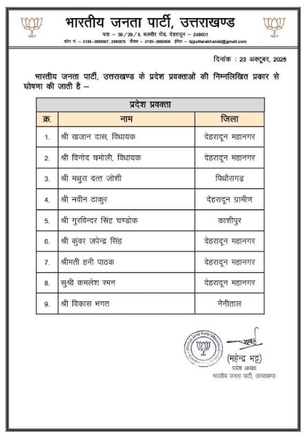काशीपुर (महानाद) : भाजपा प्रदेश अध्यक्ष महेंद्र भट्ट ने काशीपुर से गुरविंदर सिंह चंडोक सहित 9 लोगों को प्रदेश प्रवक्ता बनाया है।
