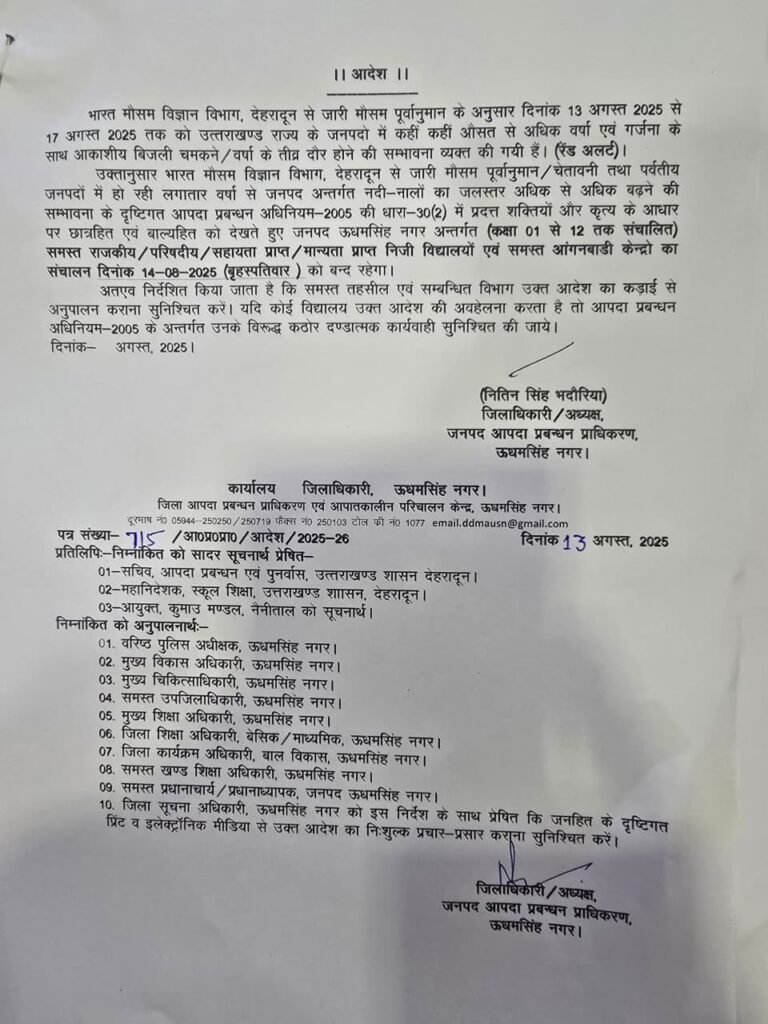 रुद्रपुर (महानाद) : उधम सिंह नगर के डीएम नितिन सिंह भदौरिया नेे भारी बारिश का अलर्ट आने के बाद कक्षा 1-12 तक के सभी स्कूलों और आंगनबाड़ी केंद्रों की छुट्टी कर दी है।