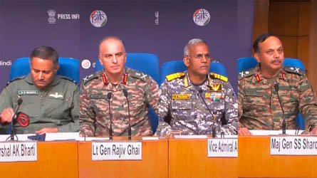 महानाद डेस्क : एयरमार्शल एके भारती, लेफ्टिनेंट जनरल राजीव घई, वाइस एडमिरल एएन प्रमोद और मेजर जनरल एसएस शारदा ने अजा प्रेस वार्ता आयोजित कर भारतीय सेना द्वारा पाकिस्तान पर की गई कार्रवाई एवं पहुंचाये गये नुकसान की जानकारी दी। तीनों सेनाओं के अधिकारी जब प्रेस ब्रीफिंग करने पहुंचे तो ऑडियो-वीडियो प्रस्तुति के जरिए भारतीय सेना ने स्पष्ट संदेश दिया। प्रस्तुति में जिस बैकग्राउंड संगीत का इस्तेमाल किया गया वह शिव तांडव स्त्रोत का है।