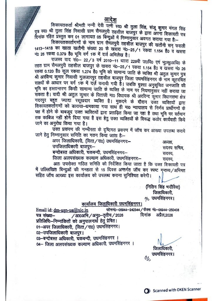 आपको बता दें कि शिकायतकर्ता नन्नी देवी पत्नी स्व. तुला सिंह, निवासी ग्राम सैंमलपुरी, तहसील बाजपुर द्वारा प्रस्तुत शिकायत पत्र में भूमि से संबंधित अनियमितताओं के कई बिंदु उठाए गए थे।