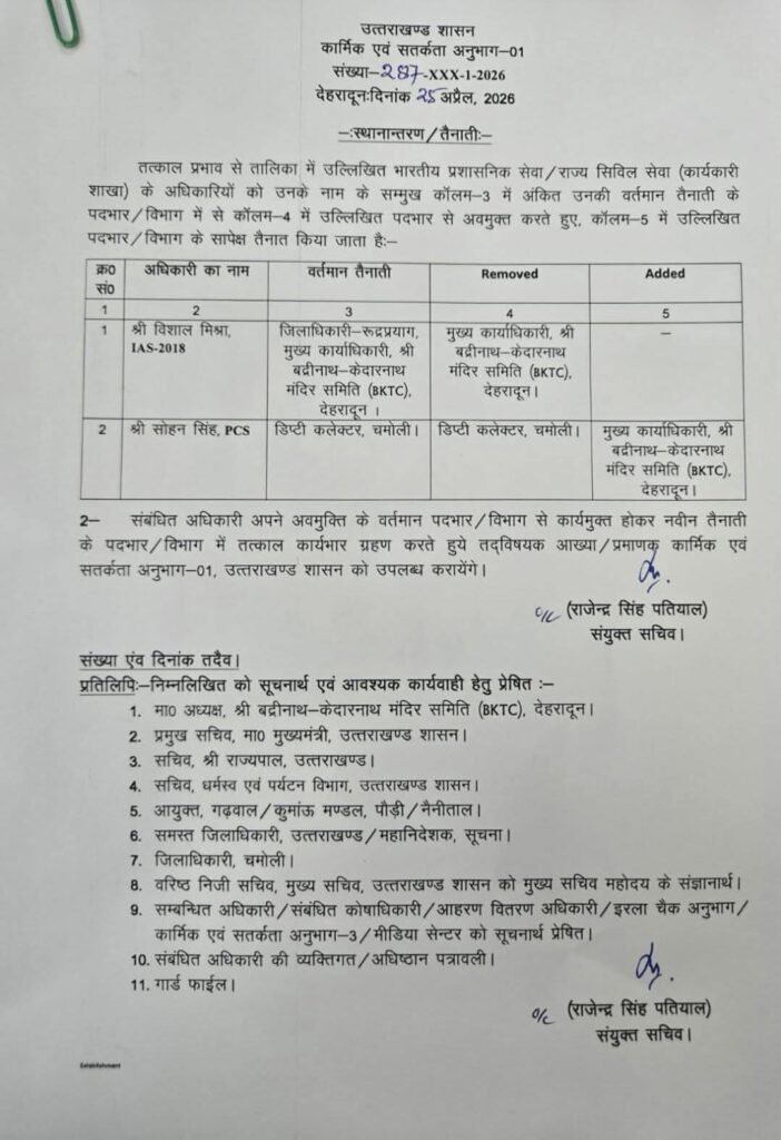 आपको बता दें कि डीएम रुद्रप्रयाग विशाल मिश्रा के पास मुख्य कार्यकारी अधिकारी श्री बद्रीनाथ-केदारनाथ मंदिर समिति (बीकेटीसी) देहरादून का पद भी था। लेकिन चारधाम यात्रा को देखते हुए उनसे यह जिम्मेदारी वापिस लेकर पीसीएस अधिकारी डिप्टी कलेक्टर चमोली सोहन सिंह को सौंप दी गई है।