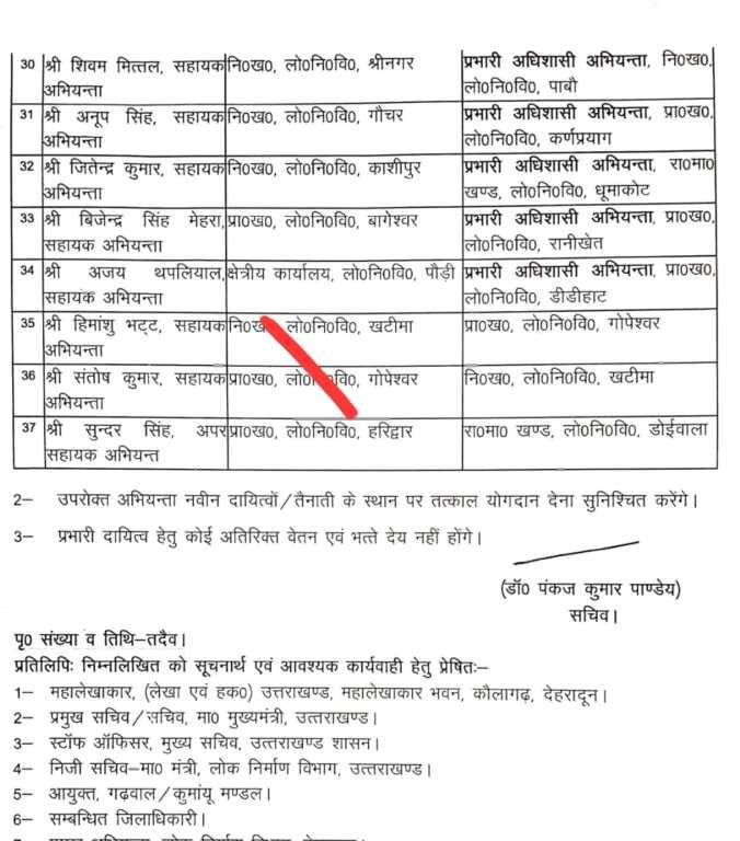 – हल्द्वानी में तैनात अधीक्षण अभियन्ता अनिल पांगती को चतुर्थ वृत्त लोनिवि, उधम सिंह नगर भेजा गया है।