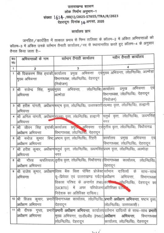 – हल्द्वानी में तैनात अधीक्षण अभियन्ता अनिल पांगती को चतुर्थ वृत्त लोनिवि, उधम सिंह नगर भेजा गया है।