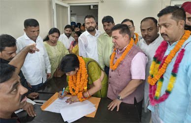 काशीपुर (महानाद) : भाजपा प्रत्याशी चन्द्रप्रभा ने ब्लॉक प्रमुख काशीपुर पद हेतु आज नामांकन-पत्र दाखिल किया। नामांकन से पूर्व वे अपने समर्थकों के साथ नगर निगम सभागार पहुँचीं और मेयर दीपक बाली के चरण स्पर्श कर आशीर्वाद लिया। वहीं मेयर बाली ने उन्हें माला पहनाकर विजयश्री का आशीर्वाद दिया।