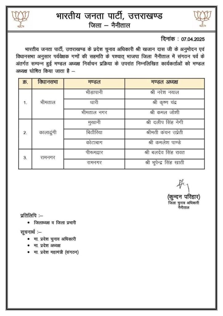 उधर, नैनीताल जिले से भूपेन्द्र सिंह खाती को रामनगर नगर मंडल का अध्यक्ष बनाया गया है। बलदेव सिंह रावत को पीरूमदारा मंडल अध्यक्ष बनाया गया है। भीमताल विधानसभा के भीमताल नगर से कमल जोशी, भीड़ापानी से नरेश नयाल तथा धारी से कृष्ण चंद्र को मंडल अध्यक्ष बनाया गया है।