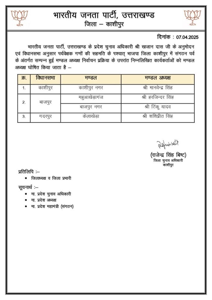 वहीं, बाजपुर विधानसभा के महुआखेड़ा गंज से हरजिन्दर सिंह तथा बाजपुर नगर से टिंकू सिंह को अध्यक्ष बनाया गया है। वहीं, गदरपुर विधानसभा के केलाखेड़ा से शशिप्रीत सिंह को मंडल अध्यक्ष बनाया गया है।