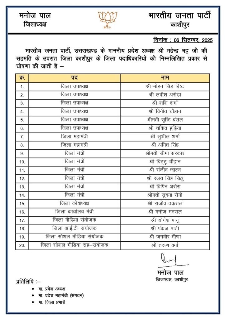 काशीपुर (महानाद) : भाजपा जिलाध्यक्ष मनोज पाल ने भाजपा प्रदेश अध्यक्ष महेन्द्र भट्ट की सहमति के बाद काशीपुर जिले के पदाधिकारियों की सूची जारी कर दी है।