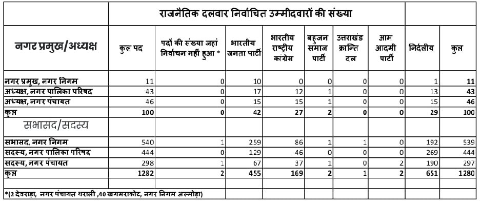 वहीं, भाजपा ने नगर निगम के 540 पार्षदों में से 259, नगर पालिका के 444 सभासदों में से 129 तथा नगर पंचायत के 298 में से 67 पर जीत दर्ज की है।