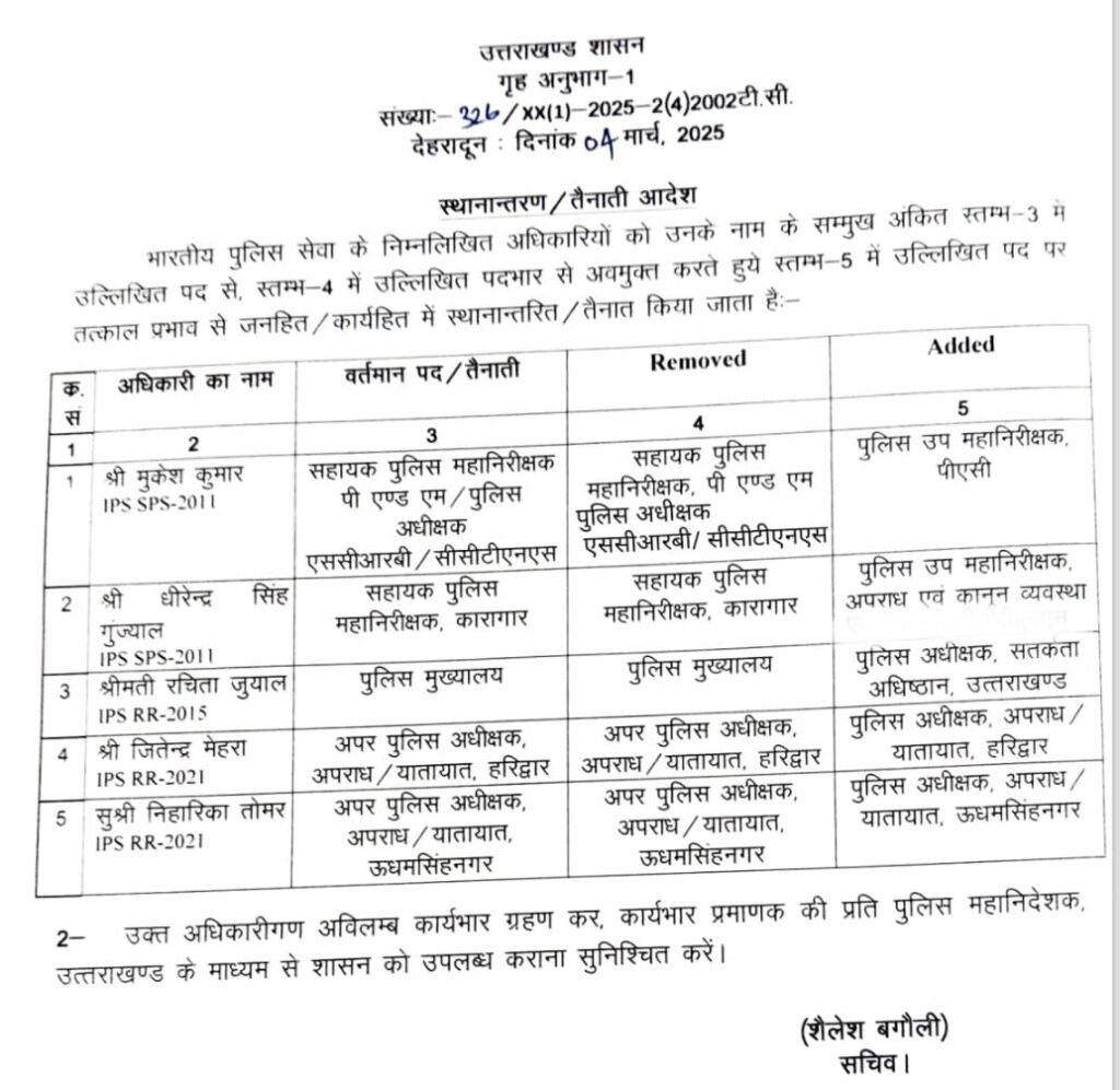 देहरादून (महानाद) : शासन ने उधम सिंह नगर की एएसपी सहित 5 आईपीएस अधिकारियों के ट्रांसफर कर दिये हैं।