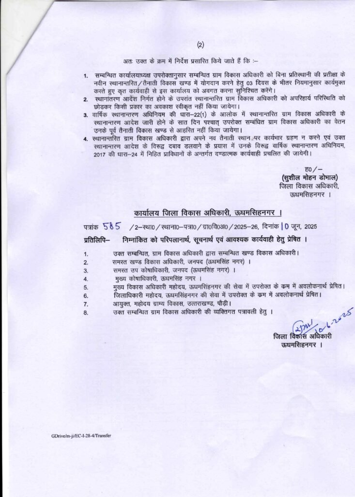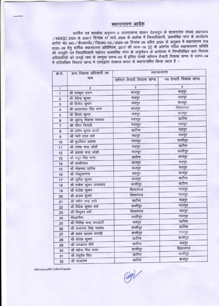 रुद्रपुर (महानाद) : मुख्यमंत्री पुष्कर सिंह धामी के पारदर्शिता एवं कार्यशैली में शुचिता के दृष्टिगत 3 वर्ष से एक ही स्थान पर नियुक्त जिले के 32 ग्राम विकास अधिकारियों का तबादला किया गया है। उनसे अपेक्षा की गई है कि सभी ग्राम विकास अधिकारी सोमवार को अपने नए कार्यस्थल पर अपना योगदान देंगे।