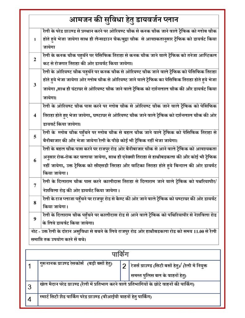 देहरादून (महानाद) : आज देहरादून में कांग्रेस द्वारा रैली का आयोजन किया जा रहा है। इसे देखते हुए देहरादून पुलिस ने ट्रेफिक डायवर्जन प्लान जारी किया है। घर से निकलने से पहले डायवर्जन प्लान देखकर ही अपनी यात्रा प्रारंभ करें।