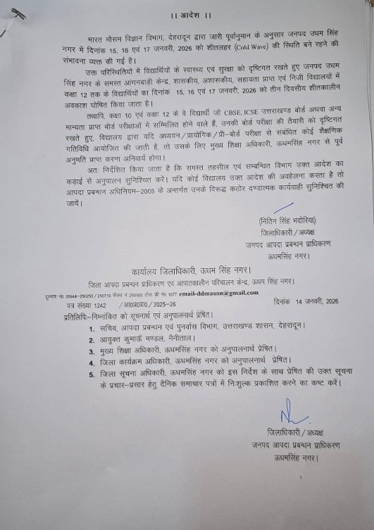 उक्त आदेश जारी करते हुए डीएम उधम सिंह नगर नितिन सिंह भदौरिया ने कहा है कि भारत मौसम विज्ञान विभाग, देहरादून द्वारा जारी पूर्वानुमान के अनुसार जनपद उधम सिंह नगर में दिनांक 15, 16 एवं 17 जनवरी, 2026 को शीतलहर (Cold Wave) की स्थिति बने रहने की संभावना व्यक्त की गई है।