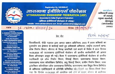 उक्त जानकारी देते हुए उत्तराखण्ड इंजीनियर्स फेडरेशन के प्रांतीय महासचिव ने बताया कि डीएम, पौड़ी गढ़वाल द्वारा आपदा प्रबंधन अधिनियम, 2005 में प्रदत्त शक्तियों का दुरुपयोग कर द्वेषभाव से कार्रवाई करते हुए अधिशासी अभियन्ता, राष्ट्रीय राजमार्ग खण्ड, लोक निर्माण विभाग, श्रीनगर के विरुद्ध प्राथमिकी दर्ज कराने के विरोध में आज दिनांक 14.09.2025 को उत्तराखण्ड इंजीनियर्स फेडरेशन की प्रान्तीय कार्यकारिणी की आपात बैठक ऑनलाइन आहूत की गई।