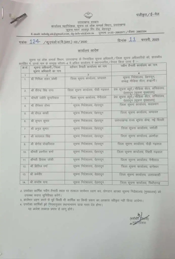 सूचना निदेशालय देहरादून में तैनात अनुज कुमार को जिला सूचना कार्यालय चमोली, सत्यपाल सिंह को जिला सूचना कार्यालय अल्मोड़ा, योगेश पोखरियाल को जिला सूचना कार्यालय पौड़ी गढ़वाल भेजा गया है।