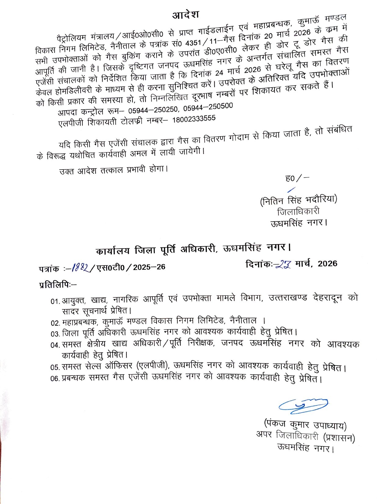 उक्त आदेश पारित करते हुए डीएम उधम सिंह नगर नितिन सिंह भदौरिया ने कहा कि पैट्रोलियम मंत्रालय/आईओसी से प्राप्त गाईडलाईन एवं महाप्रबन्धक, कुमाऊँ मण्डल विकास निगम लिमिटेड, नैनीताल के पत्रांक दिनांक 20 मार्च 2026 के क्रम में सभी उपभोक्ताओं को गैस बुकिंग कराने के उपरांत डीएसी (Delivery Authentication Code) लेकर ही डोर टू डोर गैस की आपूर्ति की जानी है।