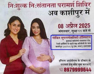 काशीपुर (महानाद) : काशीपुर की निःसंतान दंपत्तियों के लिए एक खुशखबरी है। इंदिरा आईवीएफ बरेली द्वारा काशीपुर के गोविल अस्पताल में एक निःशुल्क परामर्श कैंप लगाया जा रहा है।