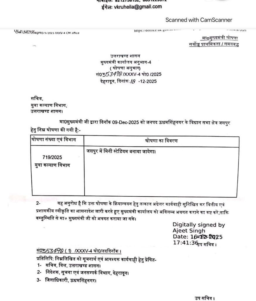 विनय रुहेला के पत्र पर कार्रवाई करते हुए मुख्यमंत्री कार्यालय अनुभाग 4 (घोषणा अनुभाग) के उप सचिव अजीत सिंह ने युवा कल्याण विभाग के सचिव को पत्र लिखकर कहा है कि मुख्यमंत्री द्वारा दिनांक 9.12.2025 को जसपुर में मिनी स्टेडियम बनाने की घोषणा की गई है। उक्त का शासनादेश जारी कर मुख्यमंत्री कार्यालय को अविलंब अवगत करायें।
