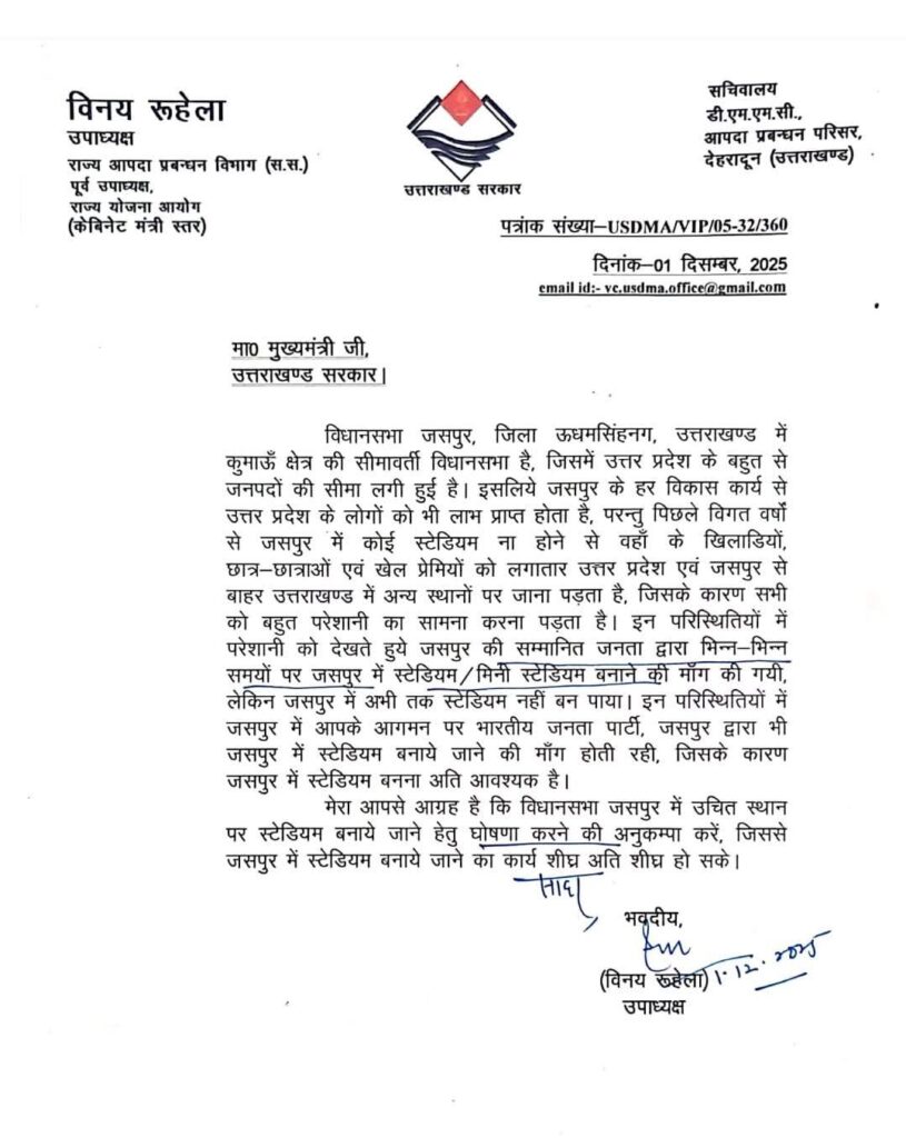 आपको बता दें कि दिनांक 1 दिसंबर 2025 को राज्य आपदा प्रबंधन विभाग के उपाध्यक्ष विनय रुहेला ने मुख्यमंत्री पुश्कर धामी को पत्र लिखकर कहा था कि विधानसभा जसपुर, जिला ऊधम सिंह नगर, उत्तराखण्ड में कुमाऊँ क्षेत्र की सीमावर्ती विधानसभा है, जिसमें उत्तर प्रदेश के बहुत से जनपदों की सीमा लगी हुई है। इसलिये जसपुर के हर विकास कार्य से उत्तर प्रदेश के लोगों को भी लाभ प्राप्त होता है, परन्तु विगत वर्षों से जसपुर में कोई स्टेडियम ना होने से वहाँ के खिलाडियों, छात्र-छात्राओं एवं खेल प्रेमियों को लगातार उत्तर प्रदेश एवं जसपुर से बाहर उत्तराखण्ड में अन्य स्थानों पर जाना पड़ता है, जिसके कारण सभी को बहुत परेशानी का सामना करना पड़ता है। इन परिस्थितियों में परेशानी को देखते हुये जसपुर की सम्मानित जनता द्वारा भिन्न-भिन्न समयों पर जसपुर में स्टेडियम / मिनी स्टेडियम बनाने की माँग की गयी, लेकिन जसपुर में अभी तक स्टेडियम नहीं बन पाया। इन परिस्थितियों में जसपुर में आपके आगमन पर भारतीय जनता पार्टी, जसपुर द्वारा भी जसपुर में स्टेडियम बनाये जाने की माँग होती रही, जिसके कारण जसपुर में स्टेडियम बनना अति आवश्यक है।
