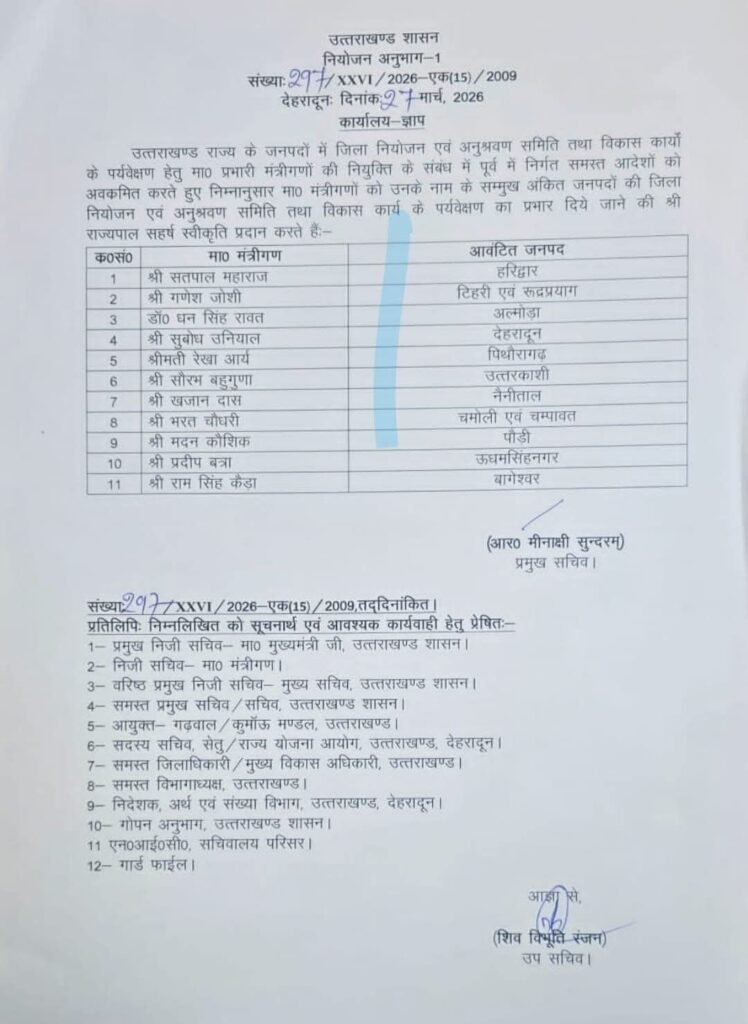 देहरादून (महानाद) : मंत्रिमंडल विस्तार के बाद उत्तराखंड शासन द्वारा जिला नियोजन एवं अनुश्रवण समिति तथा विकास कार्यों के पर्यवेक्षण हेतु नये सिरे से प्रभारी मंत्रियों की तैनाती की गई है।