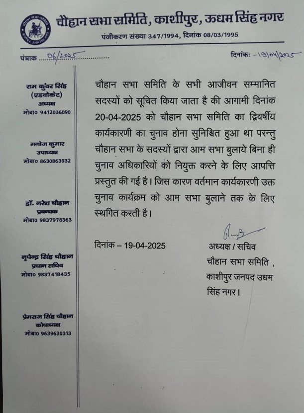 उधर, चौहान समिति के वर्तमान अध्यक्ष/सचिव ने पत्र जारी कर 20 अप्रैल 2025 को होने वाले चुनाव को स्थगित करने की घोषणा कर दी है।