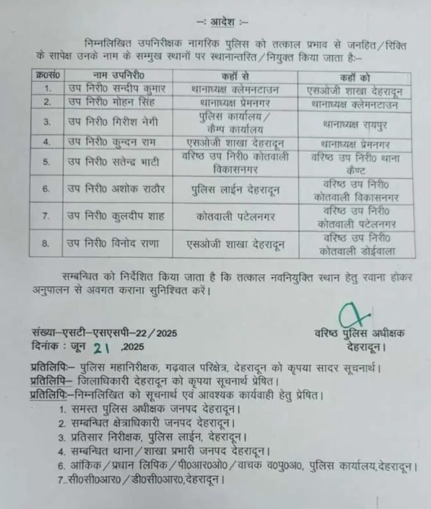 देहरादून (महानाद) : पंचायत चुनावों की घोषणा से पहले एसएसपी देहरादून अजय सिंह ने 8 दरोगाओं के तबादले कर दिये हैं।