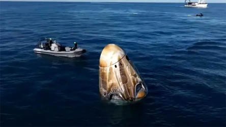 जैसे ही कैप्सूल समंदर में उतरा, वैसे ही डॉल्फ़िन कैप्सूल के चारों ओर चक्कर लगाने लगीं। मौके पर पहुंची रिकवरी टीम फास्ट बोट्स के जरिए कैप्सूल तक पहुंची और पहले सुरक्षा का जायजा लिया और पैराशूट हटाया। इसके बाद स्पेसएक्स का रिकवरी जहाज पहुंचा, जोकि लैंडिंग साइट से दो मील की दूरी पर रुका हुआ था। इसके बाद रस्सियों के सहारे कैप्सूल को सुरक्षा नाव में लाया गया। जिस समय अंतरिक्ष यान की वापसी हो रही थी उस समय आसमान पूरी तरह साफ व नीला था।
