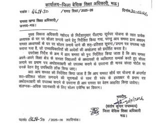जी हां, उत्तर प्रदेश के मऊ जनपद में जिला बेसिक शिक्षा अधिकारी ने एक फरमान जारी किया है। जिसमें शिक्षकों के वेतन को केंद्र सरकार की ‘पीएम सूर्य घर योजना’ से जोड़ दिया गया है। जिला बेसिक शिक्षा अधिकारी संतोष कुमार उपाध्याय ने लिखित आदेश जारी करते हुए कहा है किजिन शिक्षकों के घरों पर सोलर पैनल नहीं लगेगा, उनका वेतन रोक दिया जाएगा।