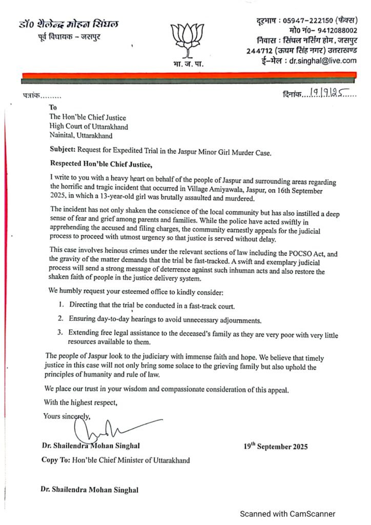 पूर्व विधायक और भाजपा नेता डॉ. शैलेंद्र मोहन सिंघल ने हाई कोर्ट उत्तराखंड के मुख्य न्यायाधीश को पत्र भेजकर ग्राम अमियावाला में दिनांक 16 सितम्बर 2025 को 13 वर्षीय मासूम बालिका के साथ हुई भयावह व दुखद घटना के सम्बंध में बताते हुए कहा कि उक्त मामले में हत्यारोपी की गिरफ्तारी हो चुकी है और क्षेत्र के लोगो की मांग है कि उक्त मामले में फास्ट ट्रैक कोर्ट का गठन कर प्रतिदिन सुनवाई की जाए, जिससे दोषी को अतिशीघ्र कड़ी से कड़ी सजा मिल सके।