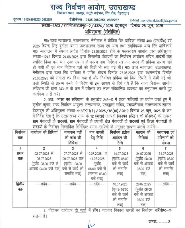 महानाद डेस्क : हाईकोर्ट से हरी झंडी मिलने के बाद एक बार फिर से उत्तराखंड में पंचायत चुनाव का बिगुल बज गया है। राज्य निर्वाचन आयेाग ने संशोधित कार्यक्रम घोषित कर दिया है।