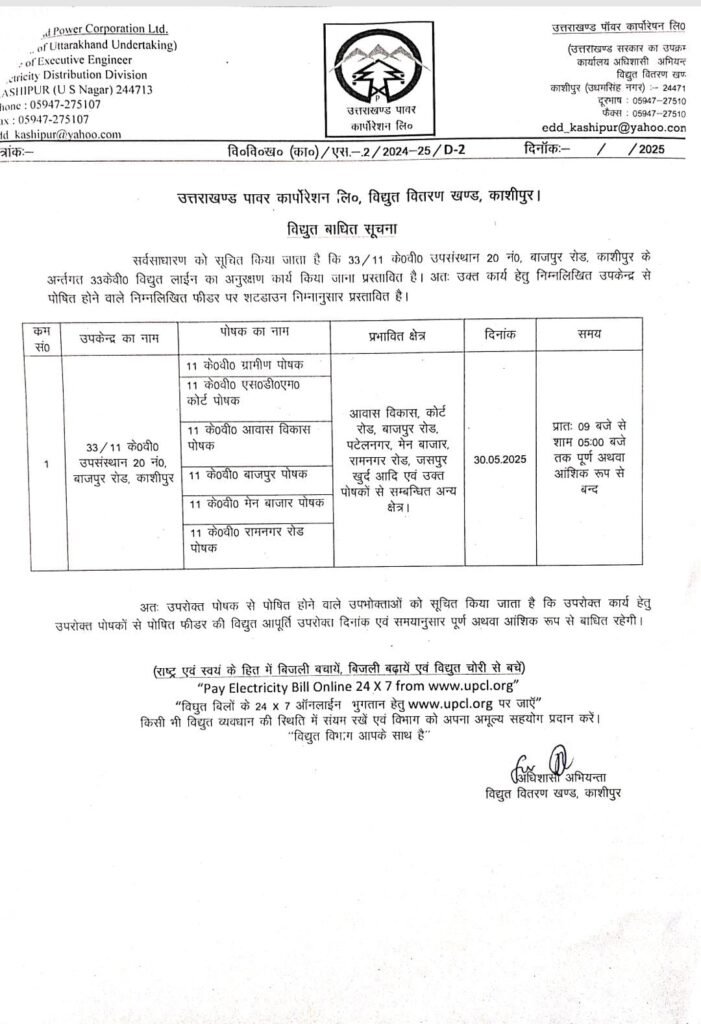 विद्युत वितरण खंड, काशीपुर के अधिशासी अभियंता ने बताया है कि 33/11 केवी उप संस्थान 20 नं.,बाजपुर रोड, काशीपुर के अंतर्गत 33केवी विद्युत लाईन का अनुरक्षण कार्य किया जाना है, इसलिए इसके अंतर्गत आने वाले आवास विकास, कोर्ट रोड, बाजपुर रोड, पटेल नगर, मेन बाजार, रामनगर रोड, जसपुर खुर्द आदि स्थानों पर आज सुबह प्रातः 9 बजे से सायं 5 बजे तक बिजली पूर्ण या आंशिक रूप से बाधित रहेगी।
