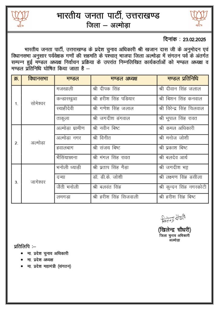 भाजपा सांगठनिक जिलों के चुनाव अधिकारियों द्वारा जनपदवार मंडल अध्यक्षों के नामों की यह अधिकृत लिस्ट इस प्रकार है –
