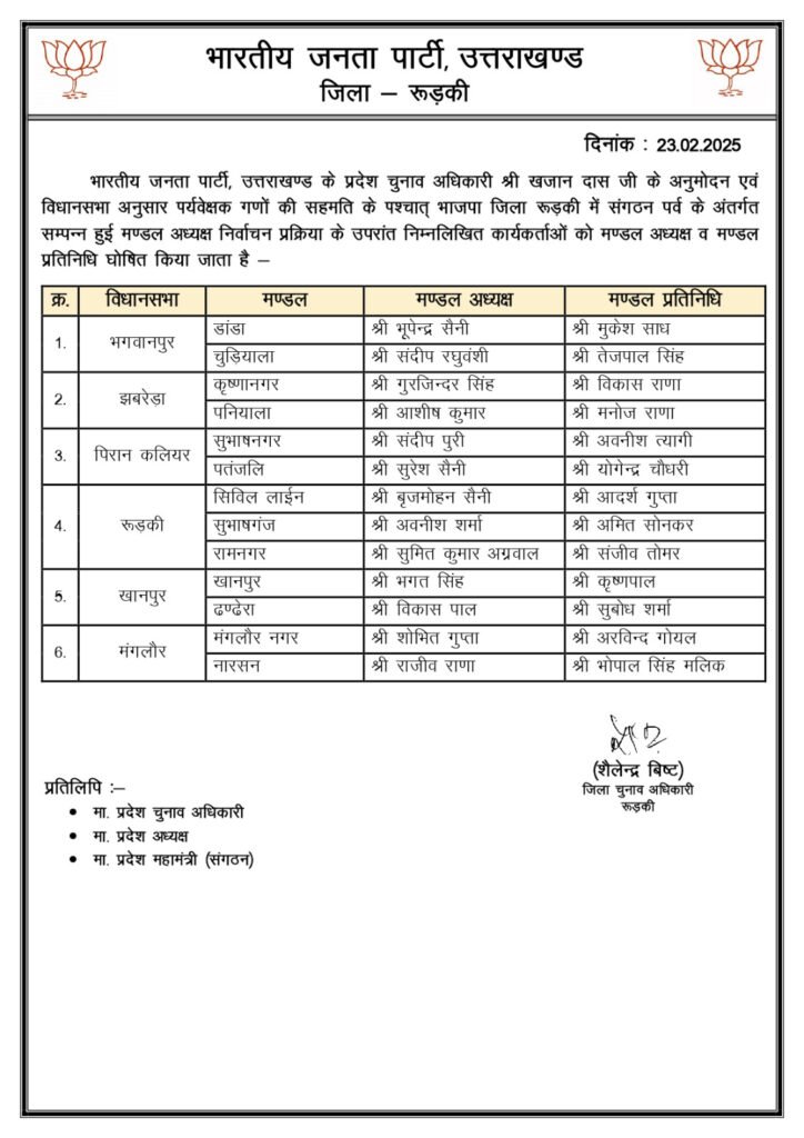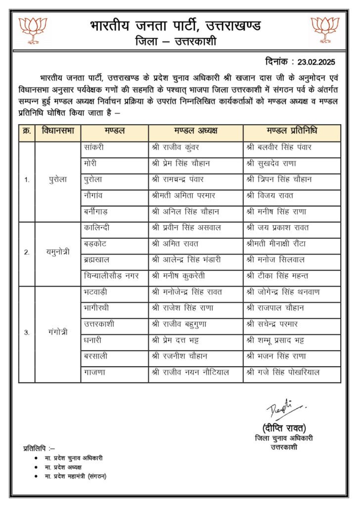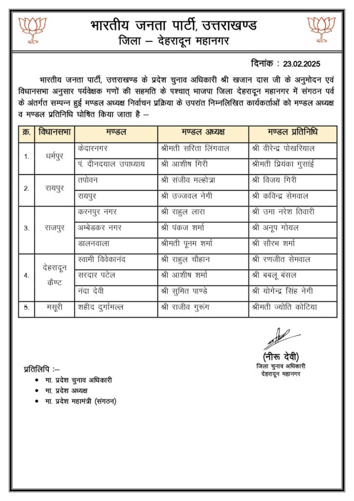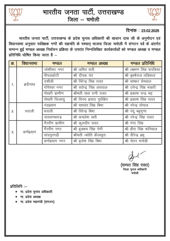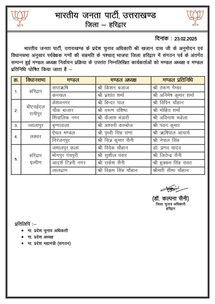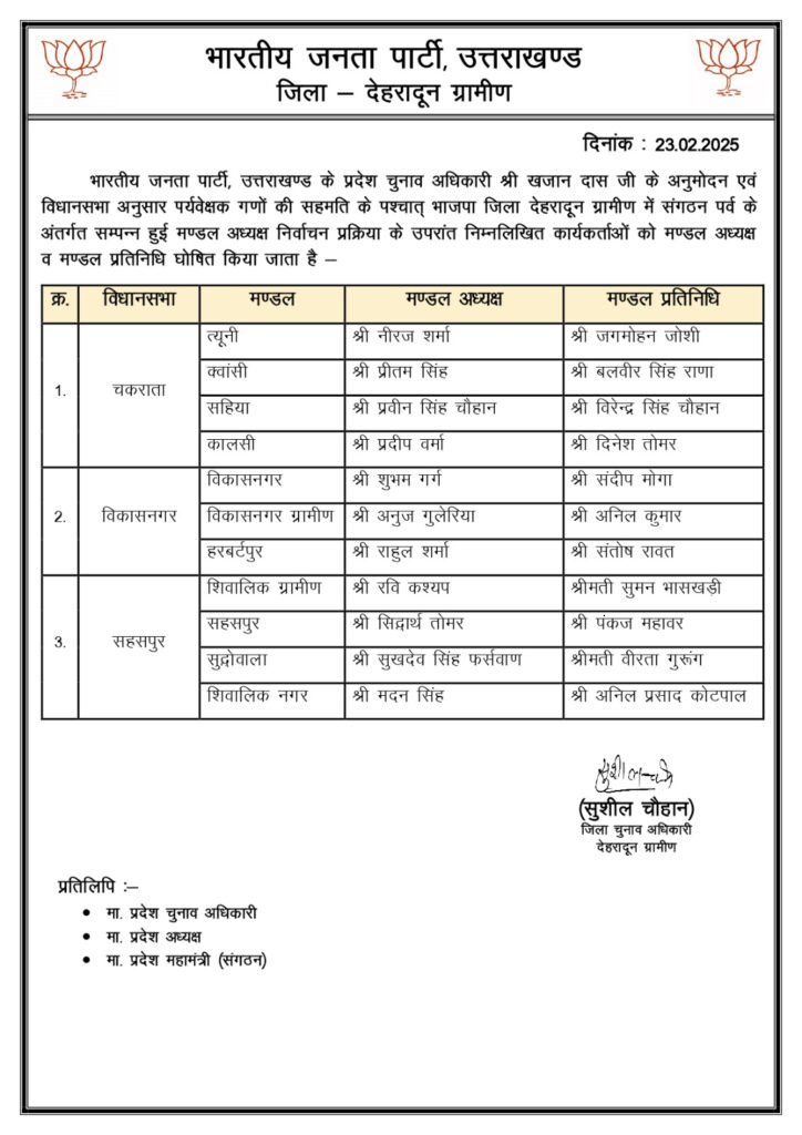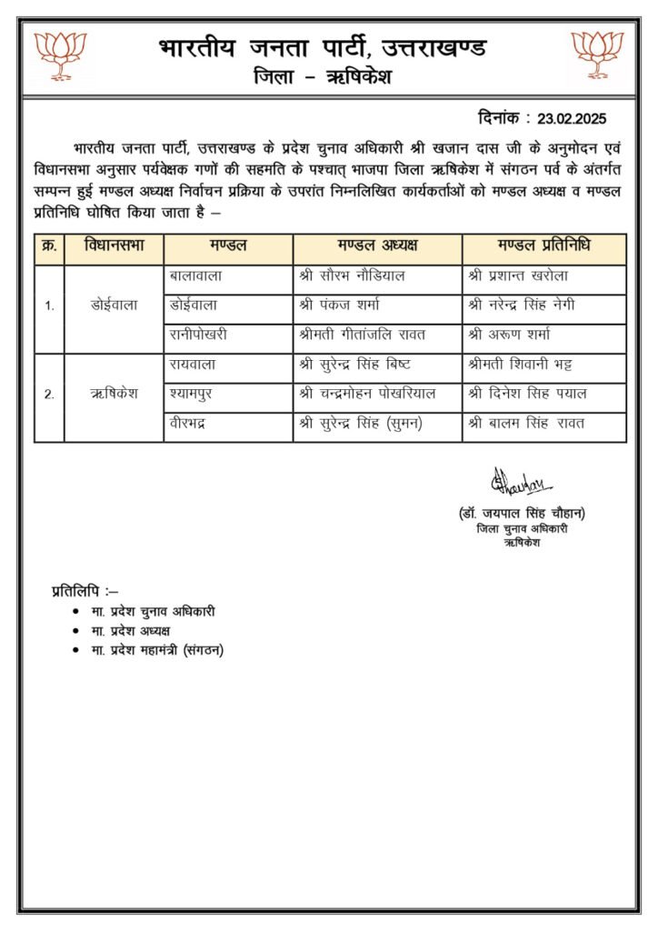 उत्तराखंड भाजपा ने जारी की जिलेवार मंडल अध्यक्षों की लिस्ट