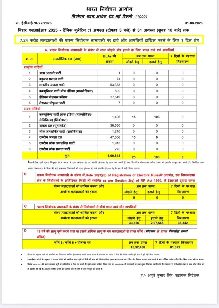 भारत निर्वाचन आयोग ने आज 1 अगस्त से 31 अगस्त तक के आंकड़े जारी किये हैं जिसके अनुसार