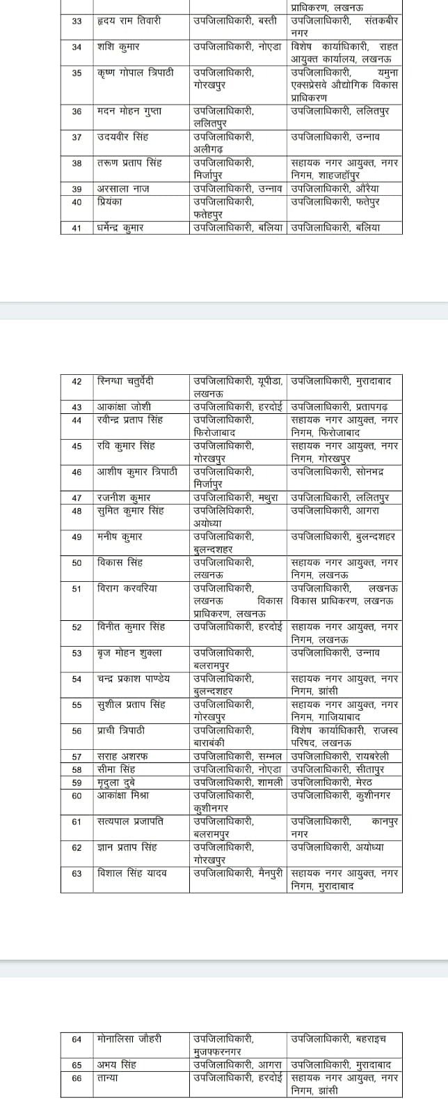 एसडीएम आगरा श्रद्धा पाण्डेय को सहायक नगर आयुक्त, नगर निगम आगरा बनाया गया है। एसडीएम कानपुर देहात प्रदुम्न कुमार को श्रावस्ती का एसडीएम बनाया गया है। गारेखपुर की एसडीएम निशा श्रीवास्तव को वाराणसी नगर निगम का सहायक नगर आयुक्त बनाया गया गया है।